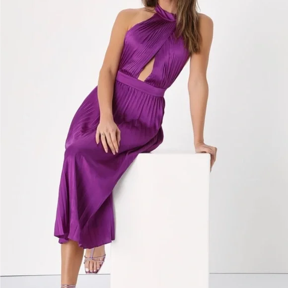 Lulu S Dresses Totally Charming Purple Satin Pleated Halter Midi Dress Poshmark